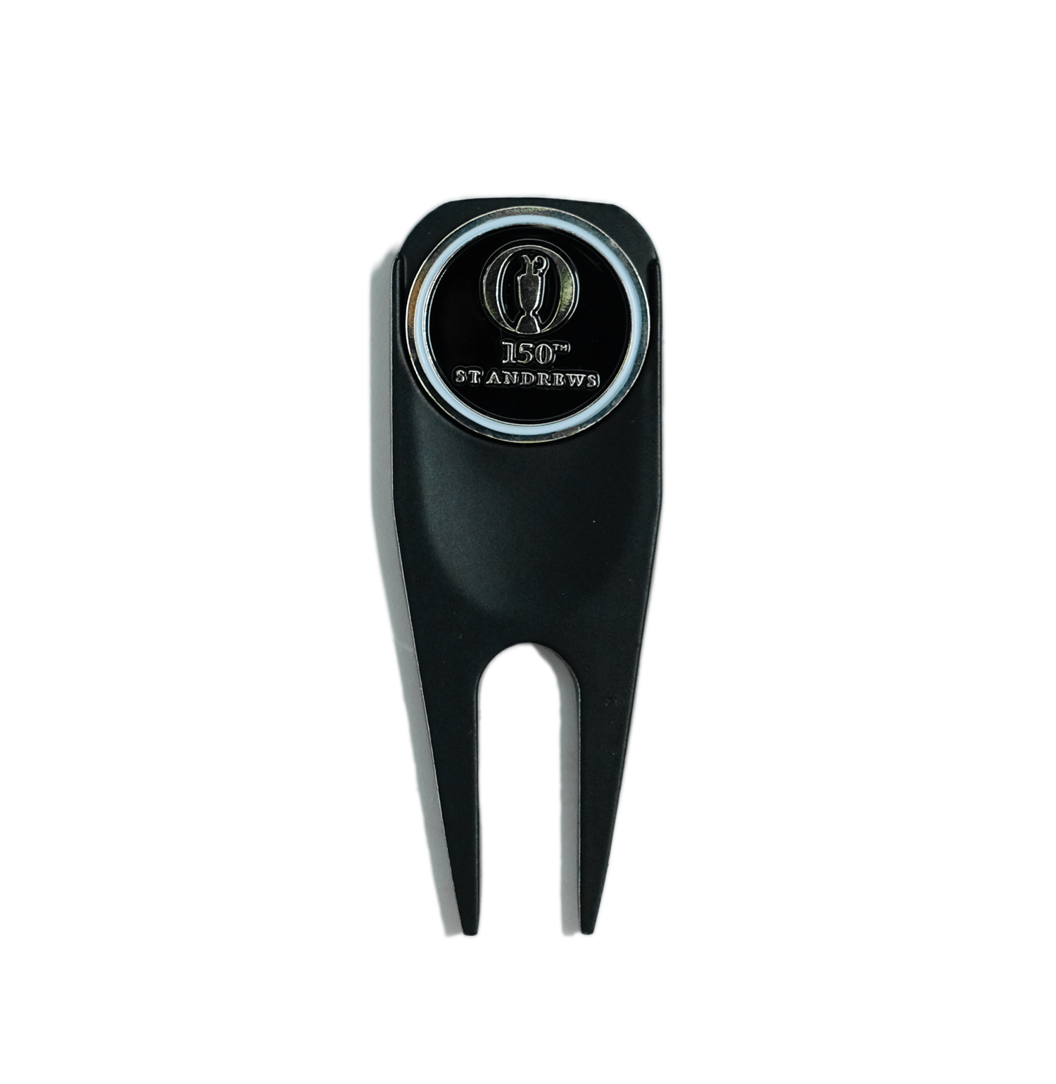 Divot tool and ball marker in black and white, featuring The 150th Open at St Andrews logo.