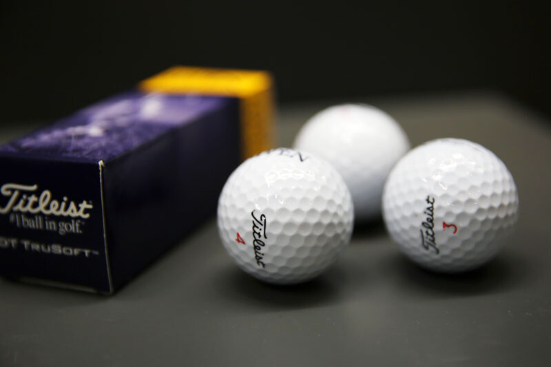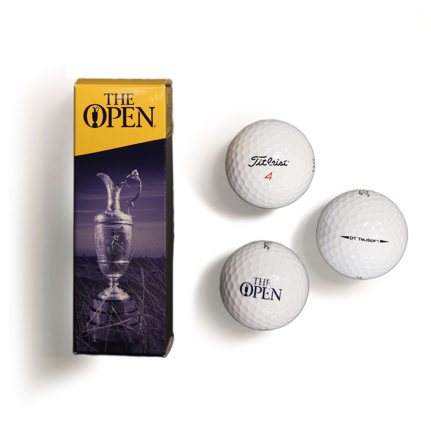 Titleist TRUFEEL sleeve of three golf balls, featuring The Open logo on each ball, contained within The Open-branded packaging.