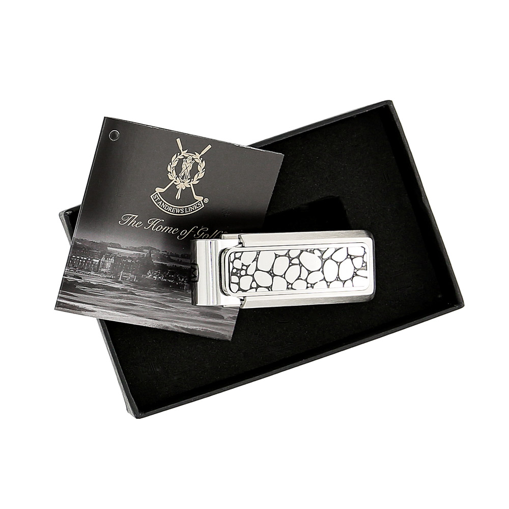 Produced by M-Clip, this silver coloured money clip features white sliding 'golf ball' panels that reveal the Swilcan Bridge logo.