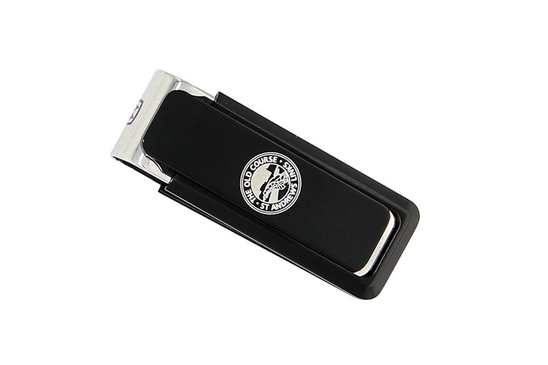 Produced by M-Clip, this money clip features black sliding panels and the Swilcan Bridge logo.