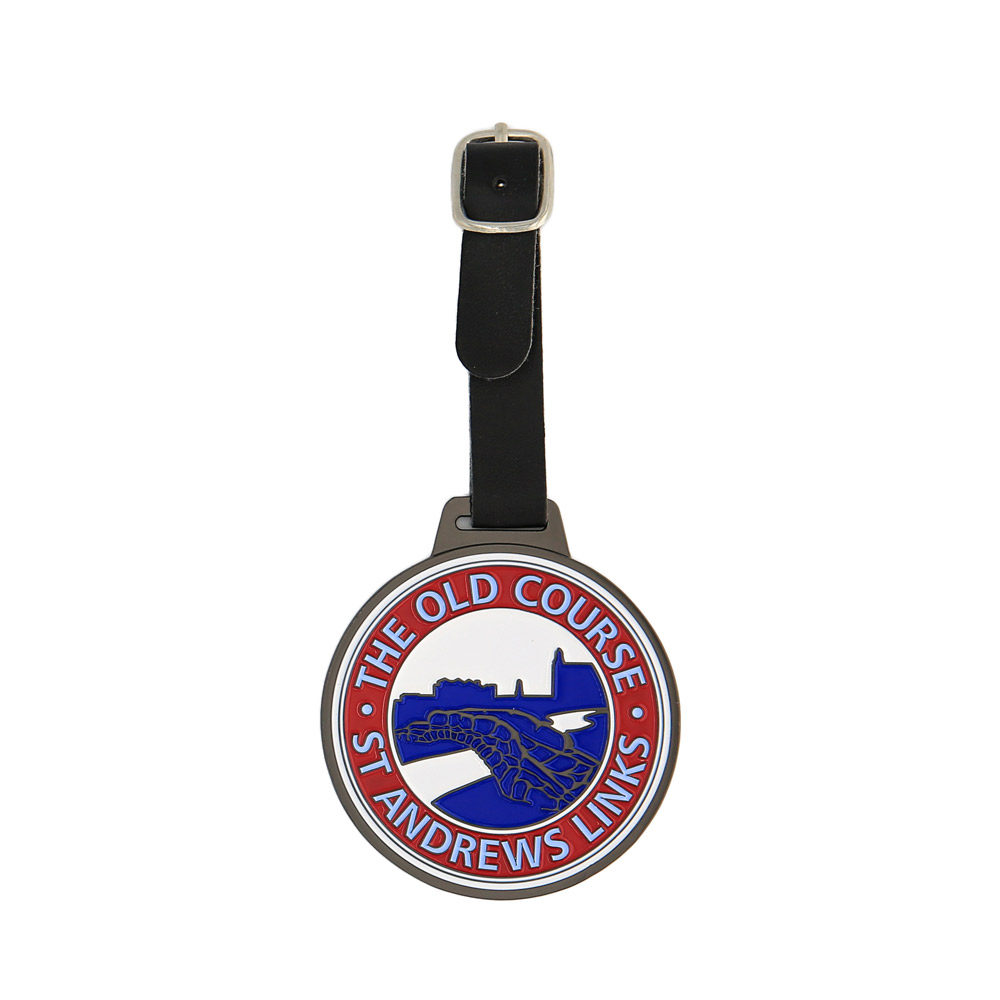 Double sided bag tag featuring the Swilcan Bridge logo in red and blue. Featuring an adjustable black strap.