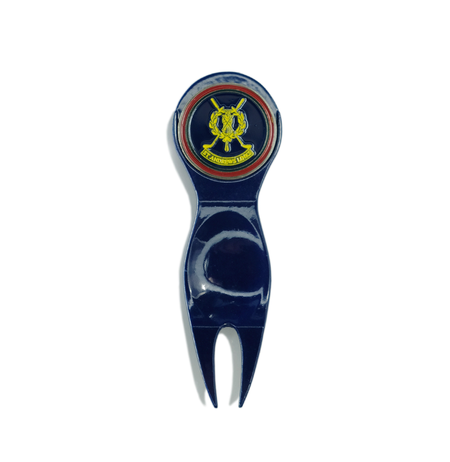 Divot tool and ball marker in navy and yellow, featuring St Andrews Links logo.