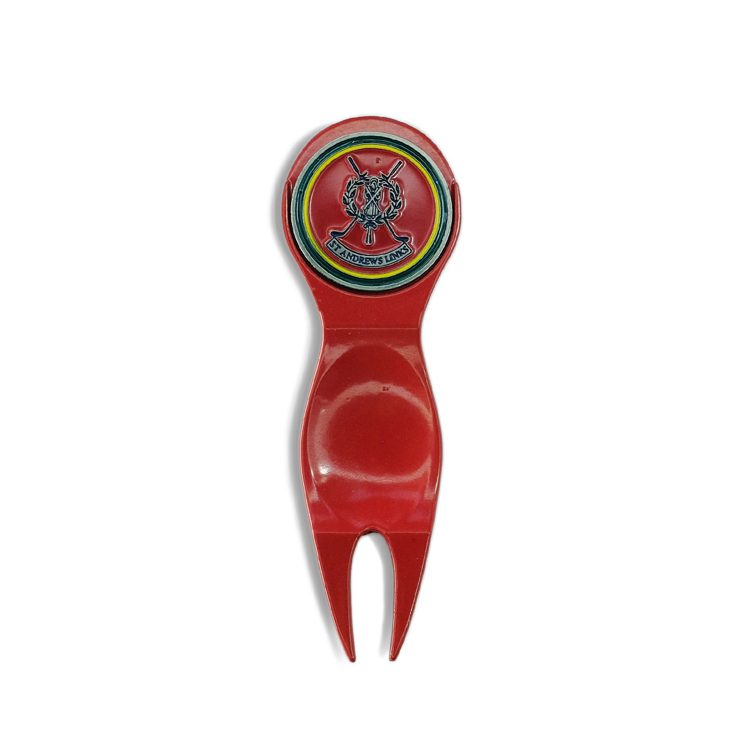 Divot tool and ball marker in red and black, featuring St Andrews Links logo.
