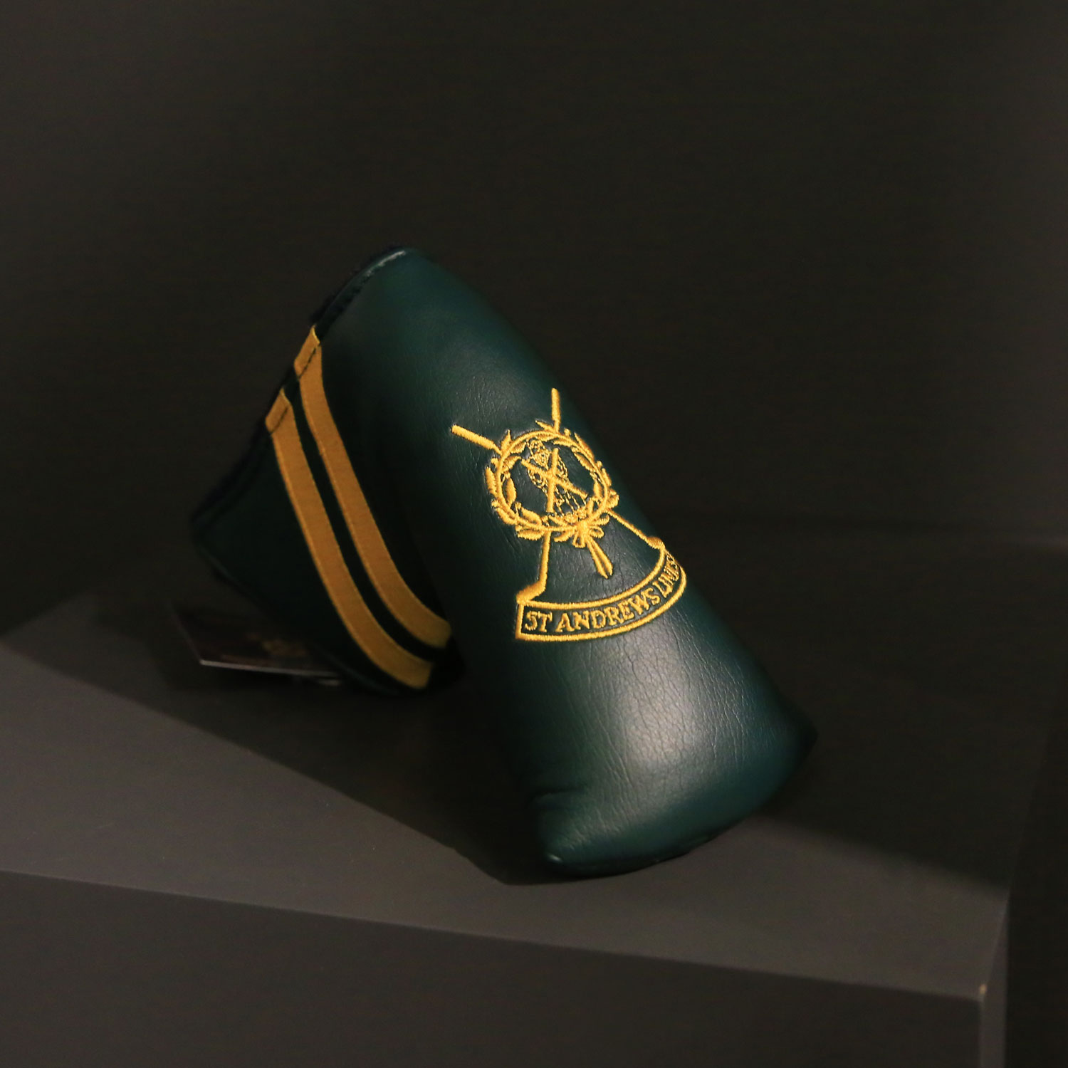 Part of the St Andrews Links Tartan Collection, this bottle green and gold putter headcover with velcro fastening features the The St Andrews Links logo embroidered in gold.