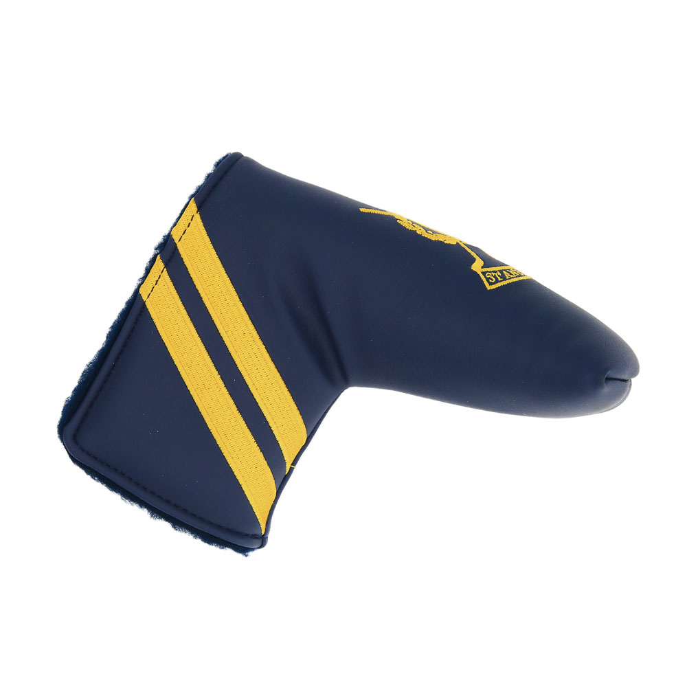 Part of the St Andrews Links Tartan Collection, this navy and gold putter headcover with velcro fastening features the The St Andrews Links logo embroidered in gold.
